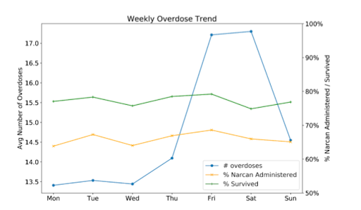 Even though overdoses start to spike in advance of the weekend, Narcan administration and survival rates are fairly steady through the week. This suggests that distribution of the life-saving drug is not keeping up with the weekend spike.