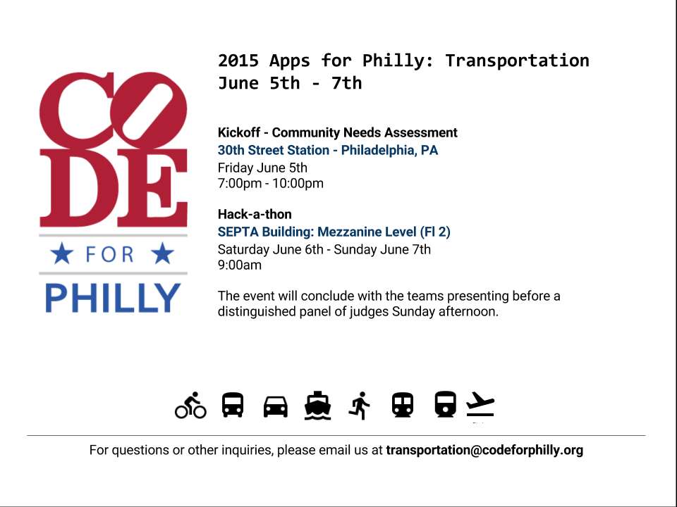 This will be Code for Philly’s fourth, and best, transportation event yet. This year we have gathered data from more sources than ever, including data from our very own projects like CyclePhilly!